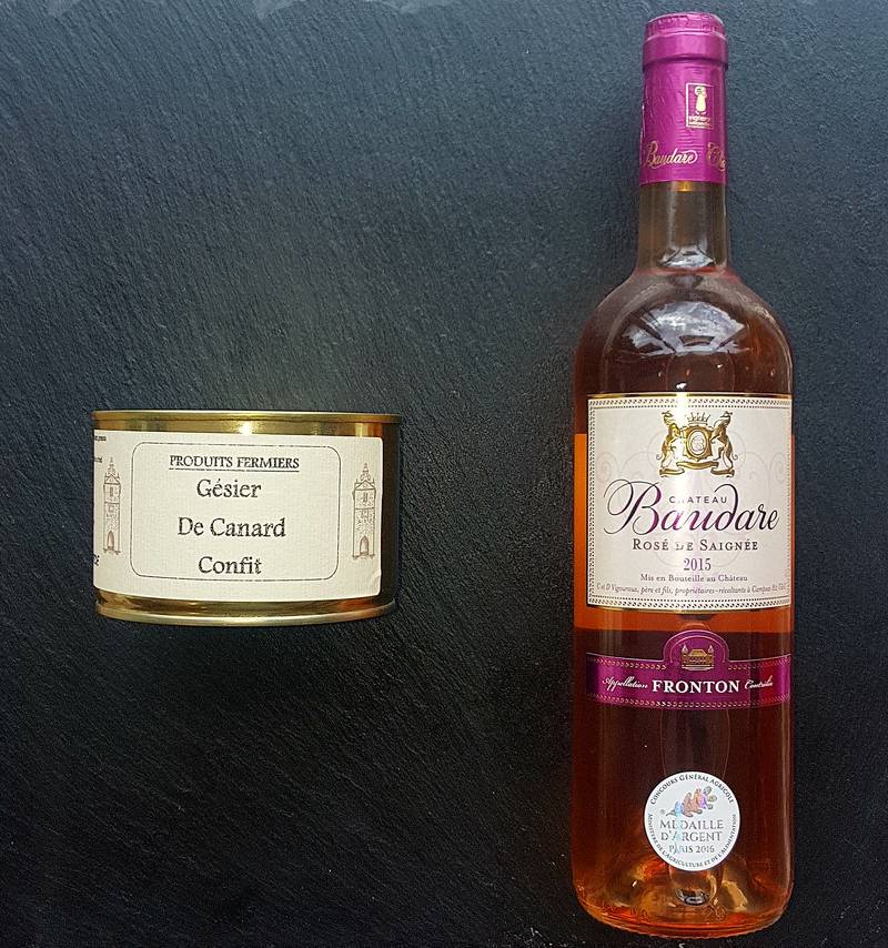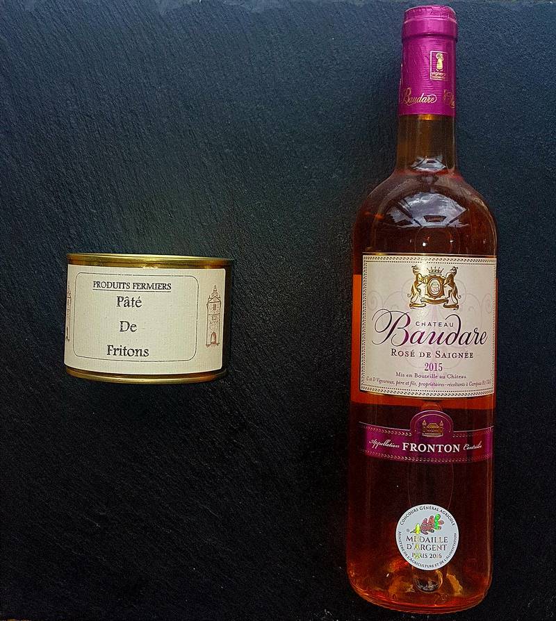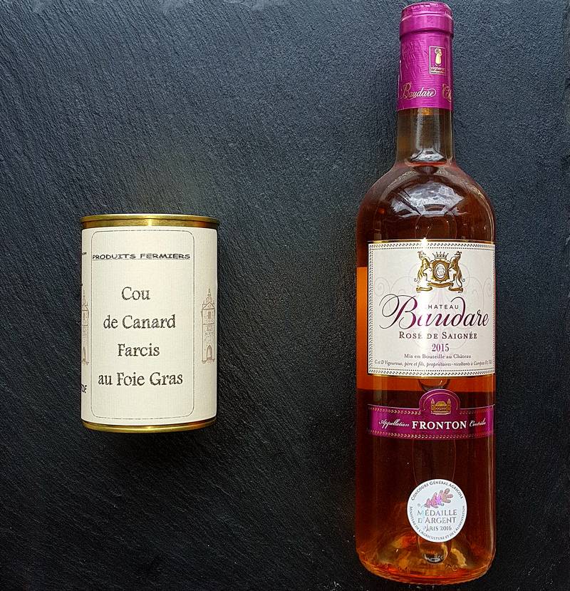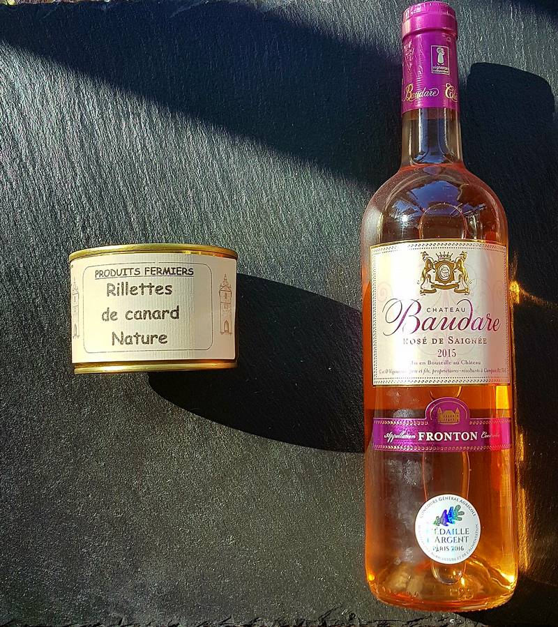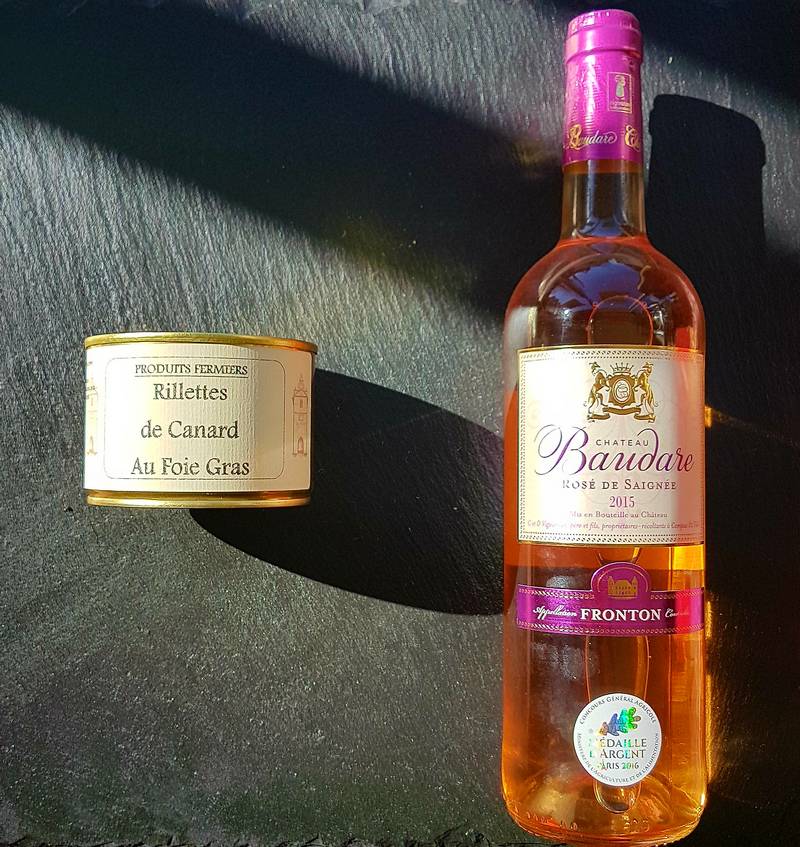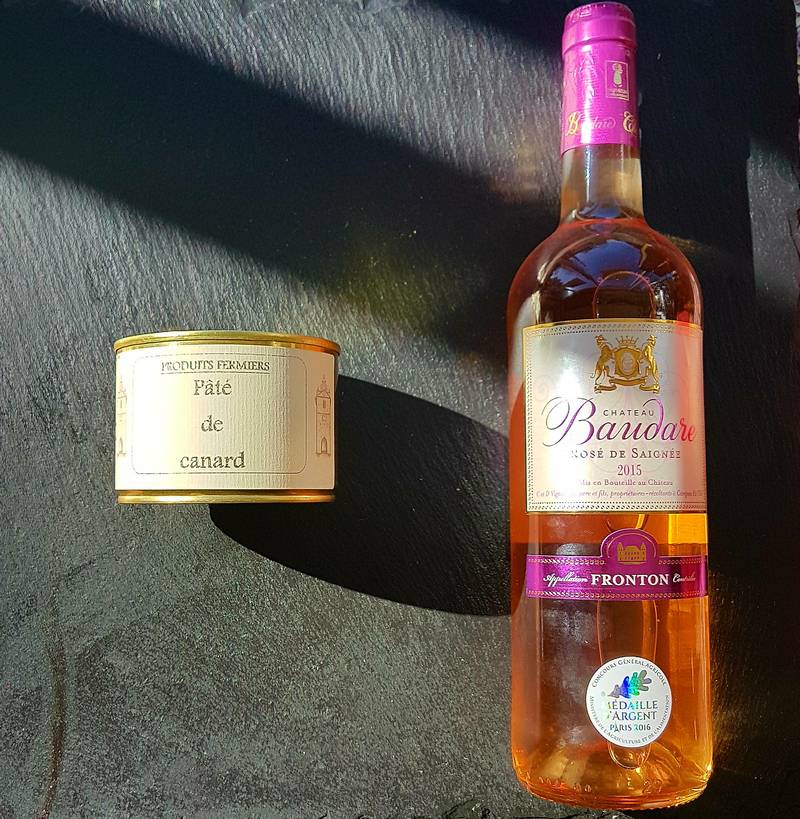 En accompagnement nous vous conseillons un vin rosé Domaine Baudare Rosé de Saignée AOC Fronton