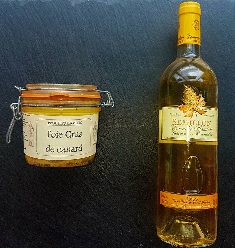 En accompagnement nous vous conseillons un vin blanc moelleux Domaine Baudare Sémillon AOC Fronton